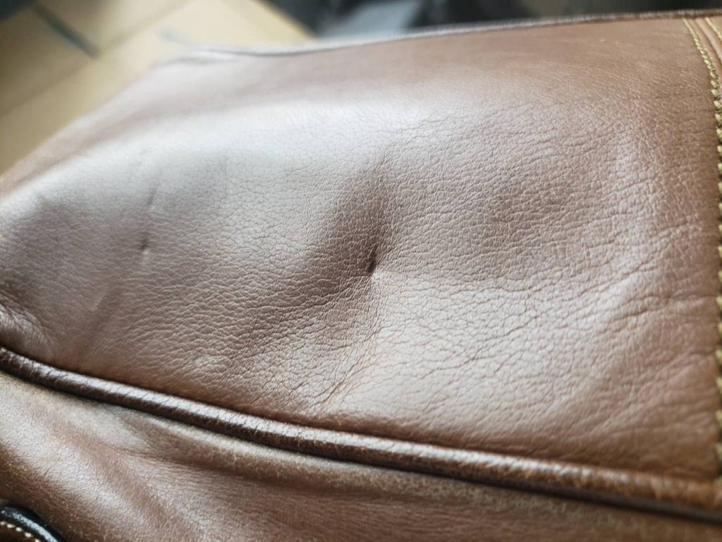 - 🔴 革自体が大きく伸びて膨らんでいる(荷物の詰めすぎが原因)