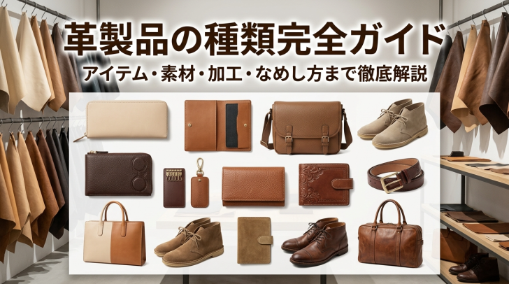 「革製品ってどんな種類があるの?」「牛革・馬革・豚革……何が違うの?」「ヌメ革とブライドルレザーは何が違う?」——革製品に興味を持つと、こんな疑問が次々と出てきます。この記事では、革製品のアイテム種類・革素材の種類・なめし方法の種類・加工・仕上げの種類まで、革の世界をまるごと一冊で解説します。これを読めば、革製品選びの目利きに一歩近づけます。