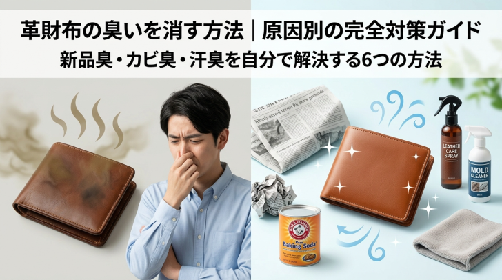 この記事では、革財布の臭いの原因を「新品の革臭(なめし剤臭)」「カビ臭」「汗臭・生活臭」の3パターンに分けて、それぞれの対処法と予防策を詳しく解説します。
