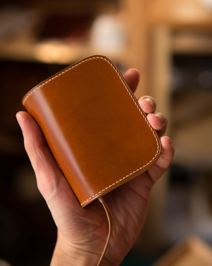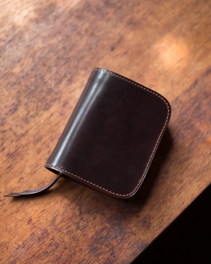 A handcrafted wallet made from Shinki Hikaku shell cordovan, showcasing the leather’s refined luster. millhandmade.comから引用)